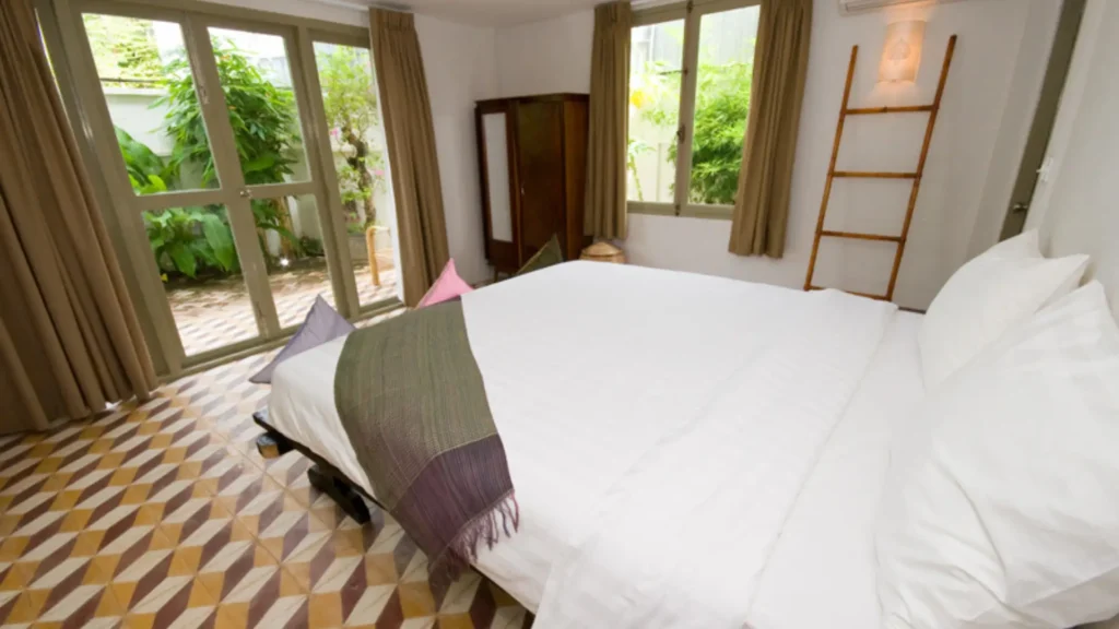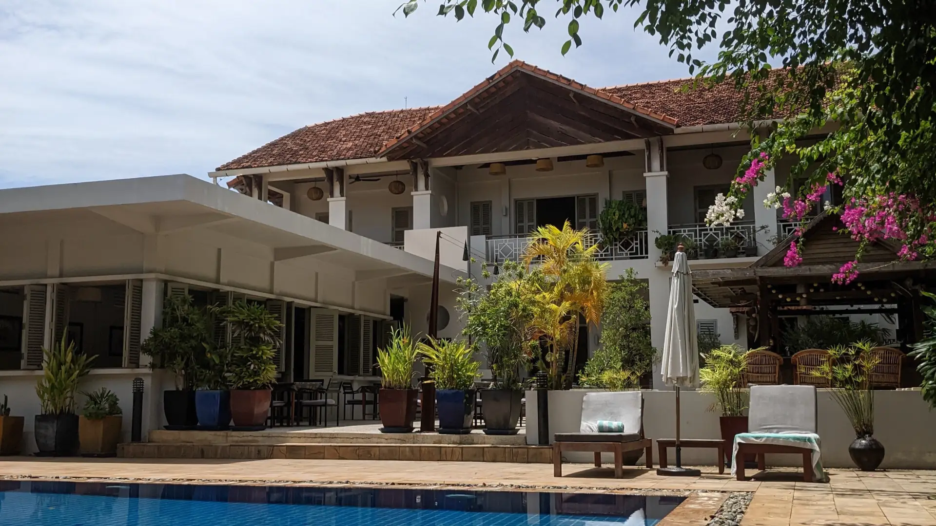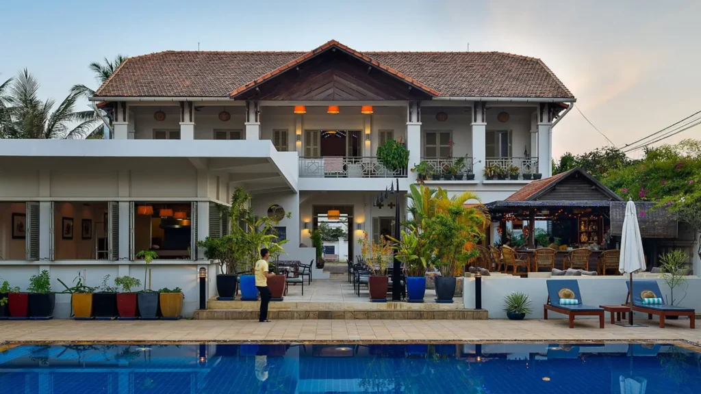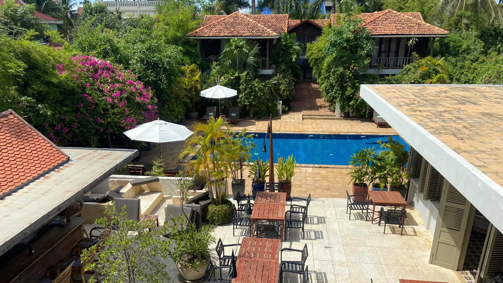 Bambu Battambang Hotel opened in September 2010 as a boutique hotel. It offers guests the ultimate accommodation experience with its 16 luxurious bedrooms arranged in 4 traditionally inspired buildings in Battambang, Cambodia. The design combines the best of local Khmer and French colonial architecture while providing guests with maximum comfort and convenience. All rooms have en suite bathrooms, air conditioning, telephone, flat screen cable TV, DVD player with access to a DVD library, iPod docker, mini bar, room safe, and private terrace or balcony. Free WiFi is provided around the site, and there are also 2 dedicated computer terminals in reception for guest use. The salt water swimming pool (14m x 6) is open from 8am to 9pm and is available exclusively to staying guests.
